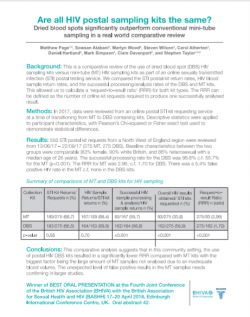 Collaborating with his institutional sponsor, the University of Birmingham, our Service also worked with the charity Saving Lives, PHE Labs Birmingham, and Wirral Integrated Sexual Health service to present a real-world evaluation of the Saving Lives Postal Testing Systems, comparing kits including minitube blood vials with those featuring “dried blood spot” cards.